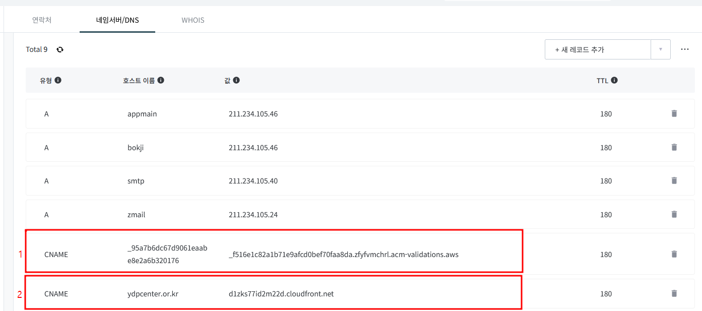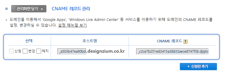 호스팅케이알 CNAME 설정, 1번으로 인증 후에 발급받은 값을 2번처럼 추가하시면 됩니다.