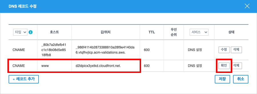 도메인 설정에서 네임서버 고급설정을 찾아서 CNAME 이란 단어를 찾으면 됩니다.