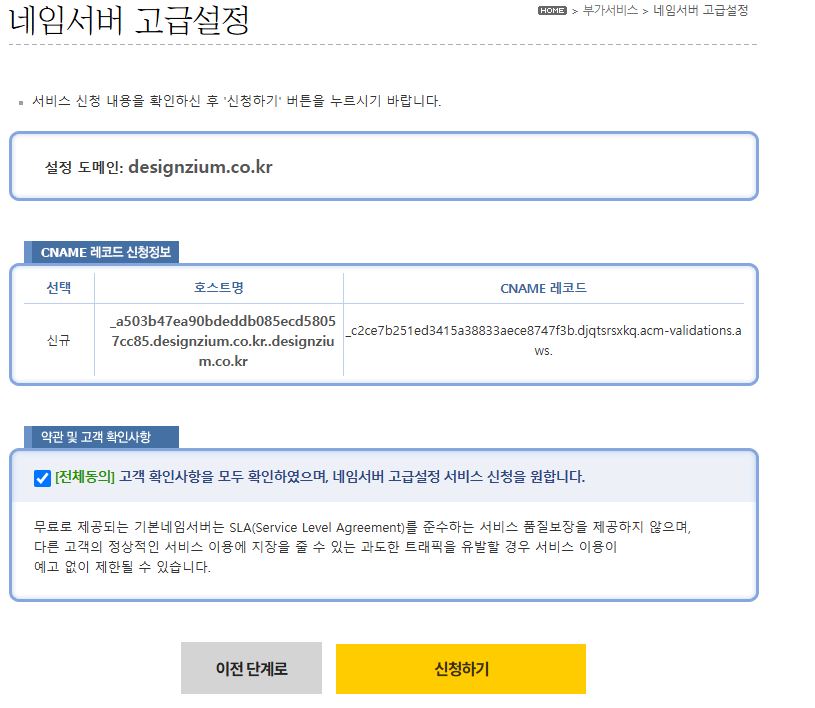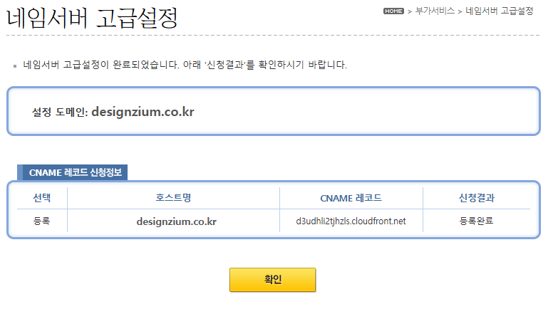 홈페이지 업체에서 A레코드 제공이 불가능하고 CNAME을 설정하라고 한다면 도메인 네임서버 고급설정에서 설정이 가능합니다.
